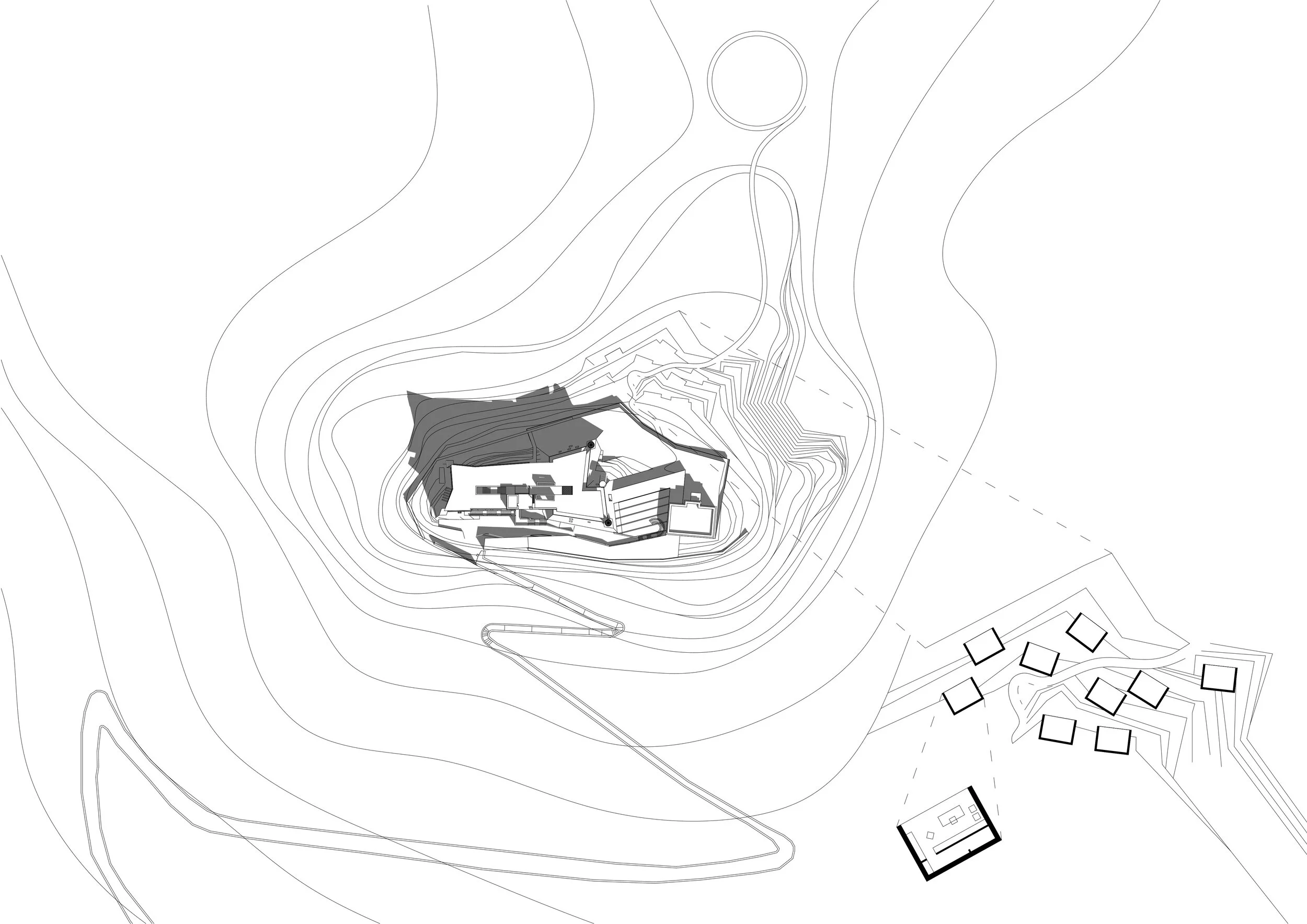 The journey is linear and led by the path that starts from the bottom of the hill, and on the top penetrates into the building and continues.