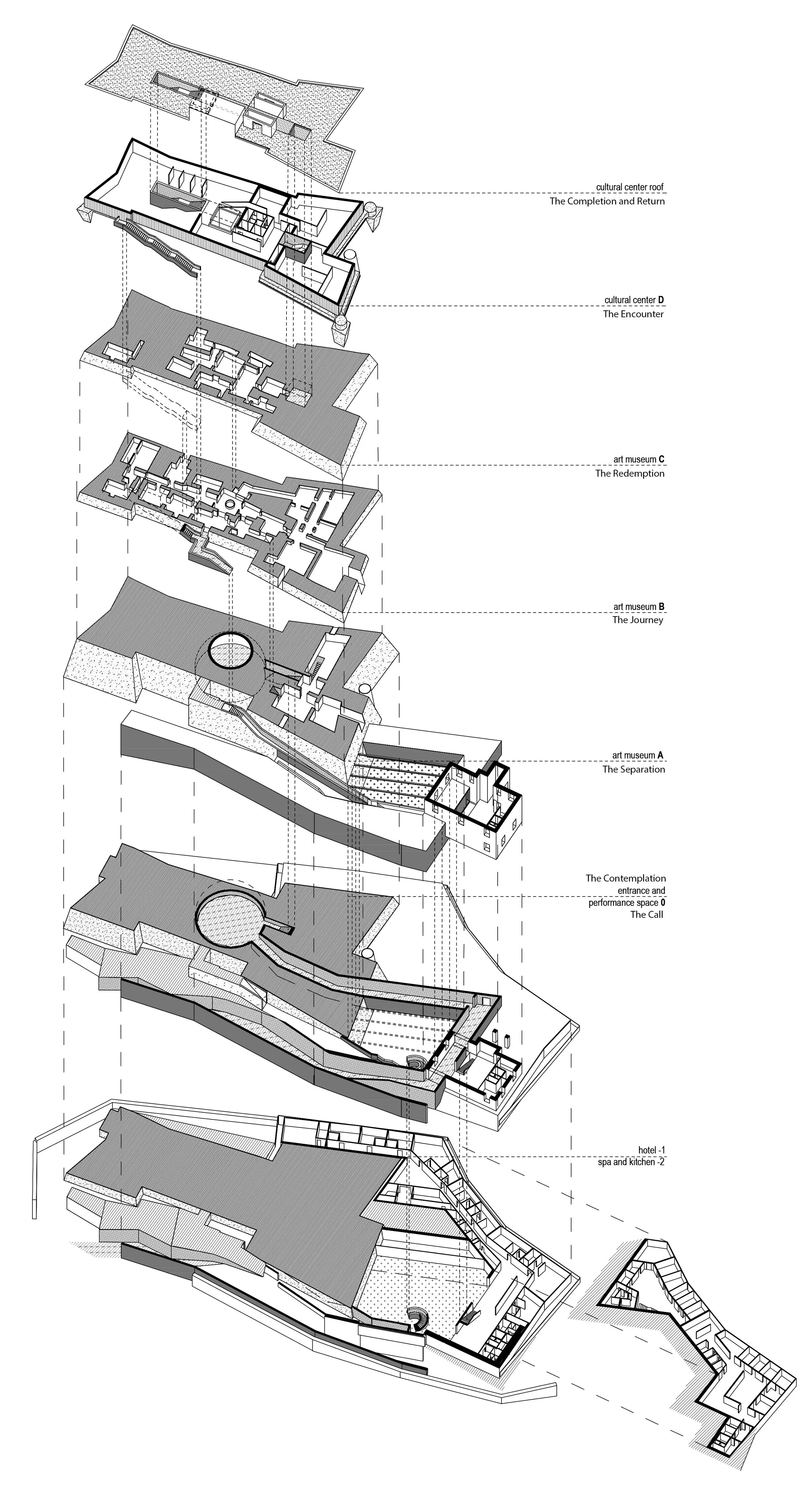Along the path different mental stages are conjured with different spatial elements and programmatic suggestions.