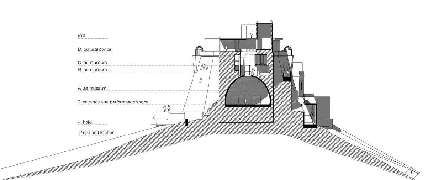 The fortress of Santa Caterina stands alone on the peak of Favignana isle, and appears as a real jewel of solitude. For more than a century the fortress has been an abandoned prison. The project aims to transform this historical place into the spiritual center of contemporary art. The proposal is led by the idea of pilgrimage, where the goal of the journey lies in the rediscovery of oneself through the medium of art. The context uses the element of solitude and art as the key elements of the spiritual journey.