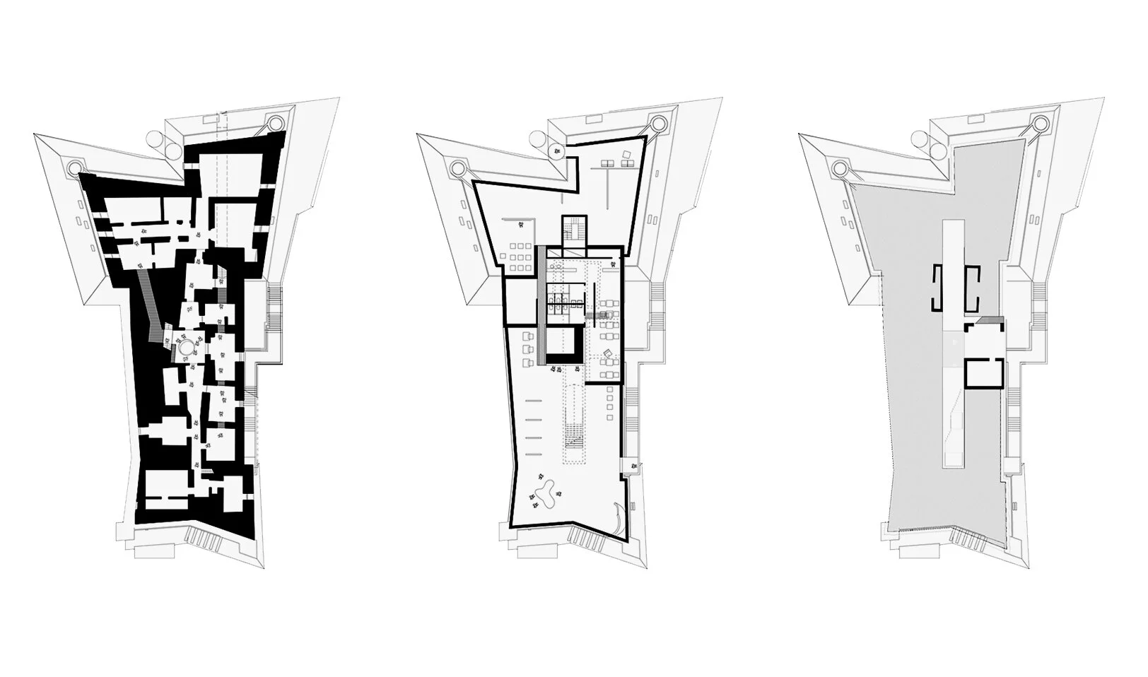 In the moment of penetration of the path the dome appears as the first interior spatial sensation. The dome as traditional architectural element of spiritual architecture spreads all the way up to the roof- but not as a point of vertical transition, but as a point of perception of the final stop of the journey.