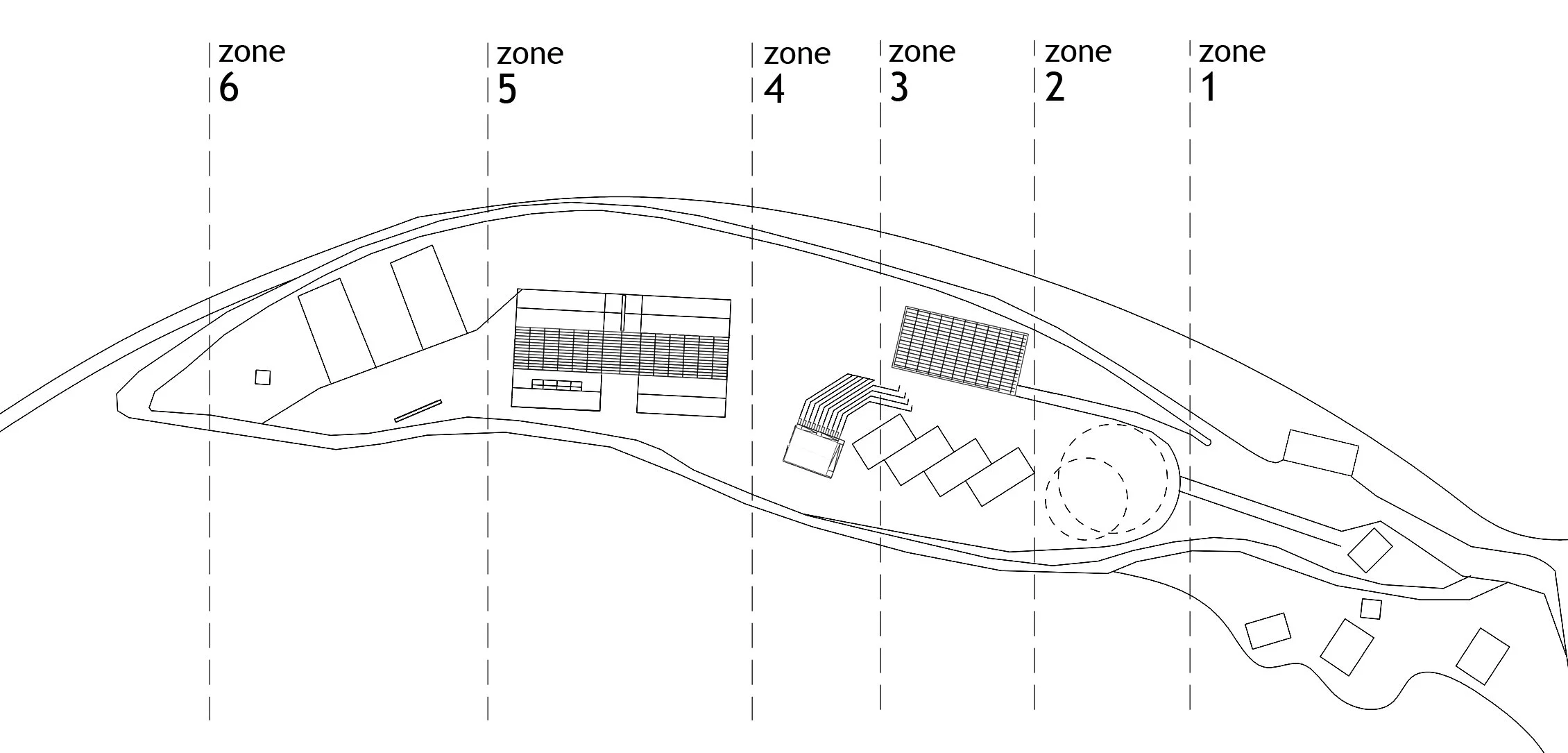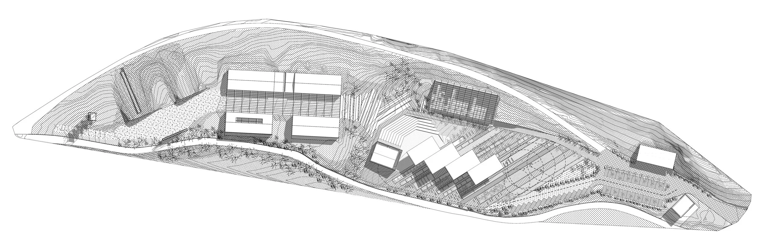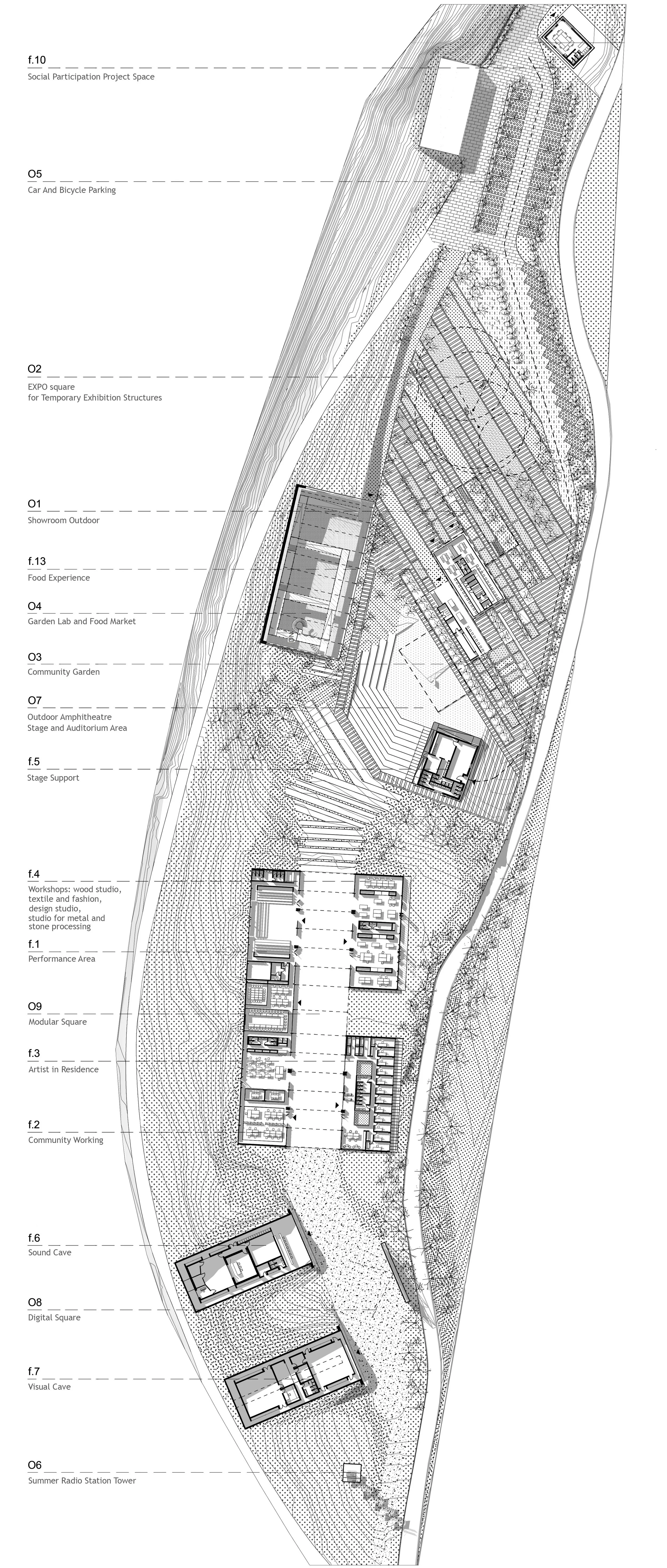 The complex is envisioned as a spatial and conceptual series of zones and microambients, each one having its unique spatial and development strategy. The predominantly public zones s are placed at the entrance zone.