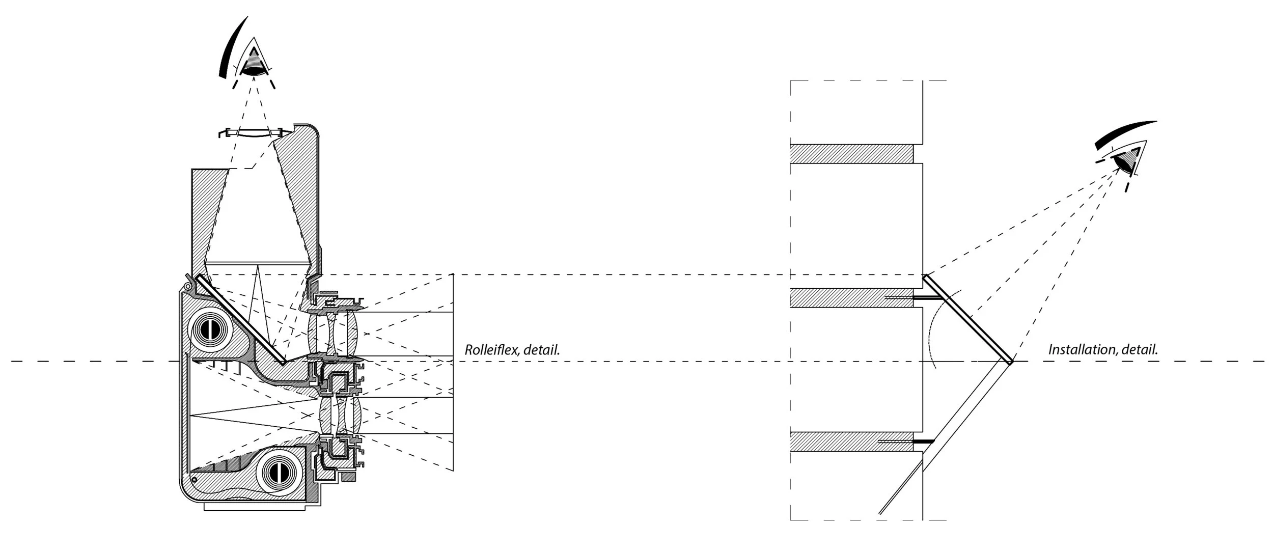Transmitting the concept of the functioning of this specific camera and the person who manages it (keeping the waistline height, the angle of the Rolleiflex’s mirror and the size of the film), a new ‘infinite camera’ is born. The image reflected in a mirror is a 'placeless place', an unreal virtual place that allows one to see one's own visibility.